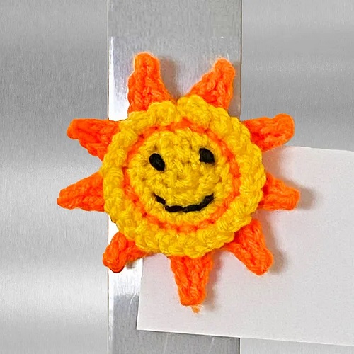 Bring the sunshine and its warmth to your home with this crochet sun fridge magnet pattern by Stitches and Scraps. It takes a 5mm crochet hook and a few half, single, and double stitches to create the pattern.