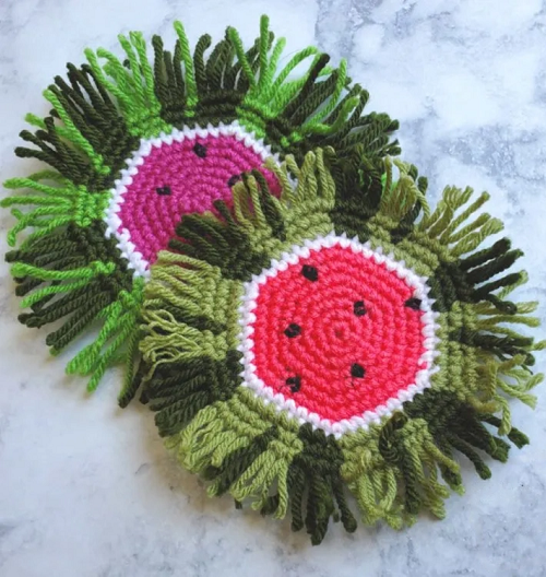 Attach the summer vibe to your table with this Watermelon crochet coaster pattern from Divine Debris, featuring a tassel detailing. Use a 4 mm hook and a different colour yarn for detailing.