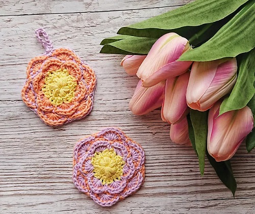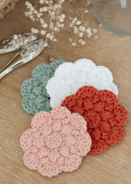 These floret face pads by Mijo crochet work up fast and feel gentle on the skin. The small flower shape makes them easy to hold. Great for daily washing or makeup removal using leftover cotton yarn.