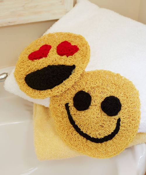 Happy scrubbies by yarnspirations bring a smile while getting the job done. They are fast to make and easy to use. Great for kids, gifts, or adding personality to everyday cleaning.