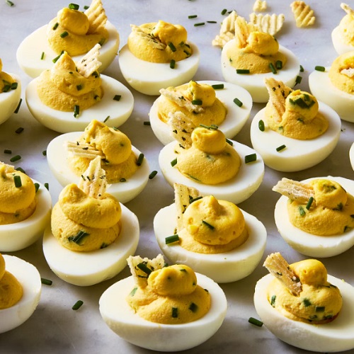 Still eating the boiled eggs with no dressing? Stop there and try these Sour Cream & Onion Deviled Eggs by Delish. It’s creamy, tangy, and crunchy, making it perfect for party games with your friends.
