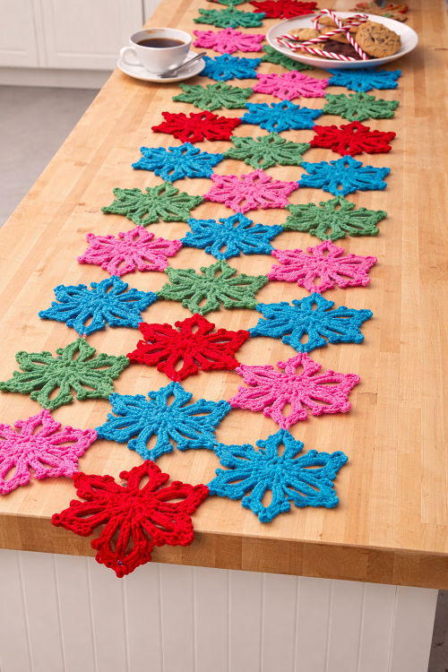 This design creates a clean and even look using repeated snowflake shapes. It pairs well with simple tableware and adds texture without crowding the space, making it useful for both casual and formal dining. Check the pattern on yarnspirations.