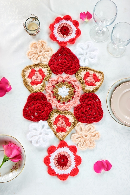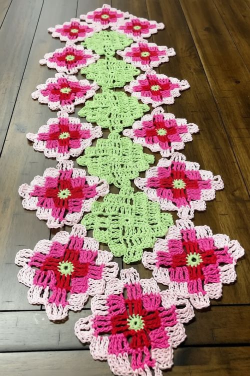 This runner by yarnspirations focuses on bold flower shapes that repeat across the table. It is fun to make and easy to adjust in length. A good option if you enjoy colorful and lively crochet projects.