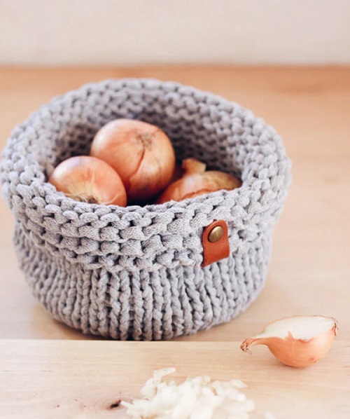 This knitted basket on Etsy is designed for everyday kitchen storage. It works well for onions, cloths, or small items and is a good project if you want something useful and fast.