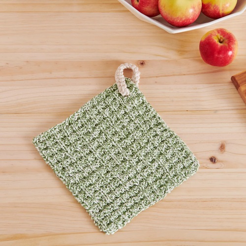 A basket-style hanging dishcloth to aid your kitchen cleaning. This knitted pattern by Lily Sugar ‘n Cream is even for beginners and uses textured stitches to complete this kitchen project.