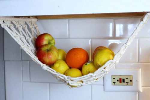 Don’t forget that your kitchen corners can be very useful. Use them to hang this corner macrame fruit hammock, and use every available space. It’s lightweight, washable, and easy to handle.