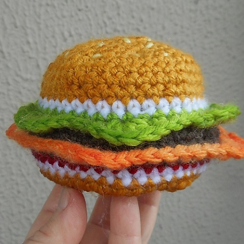 Make mini decorative pieces for your kitchen within an hour with this crochet one-piece Hamburger by Ravelry. The piece requires no sewing except for the sesame seeds and can be made with any yarn.