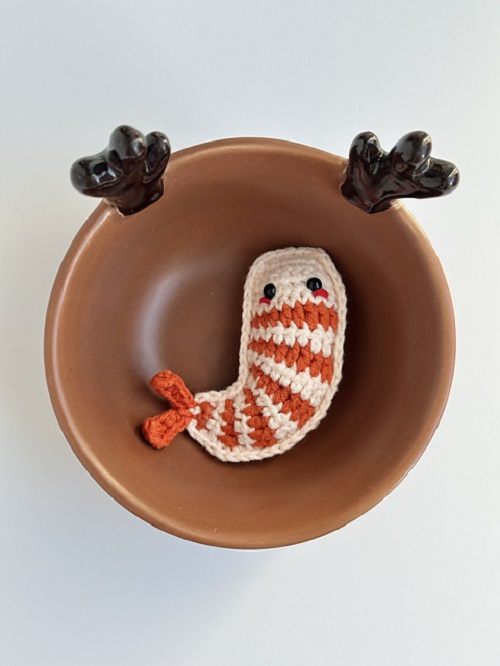 Give your friend a cute and mini handmade gift with this Crochet Shrimp by Ravelry. It’s easy to make, requires a 2.5 mm hook, and some 100% polyster fibre to give the shrimp a puffy look.
