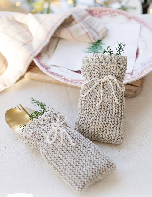 These small bags by GarnStudio are quick to knit and make great holiday table decorations. They turn simple cutlery into a festive detail. A fun project that adds charm without taking much time.