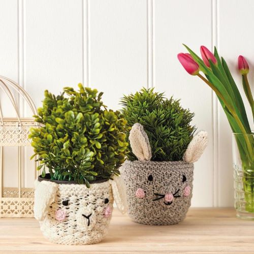 These covers by Letsknit dress up plain plant pots and add fun to kitchen shelves. Each one knits quickly and uses little yarn. Great for adding personality without clutter.